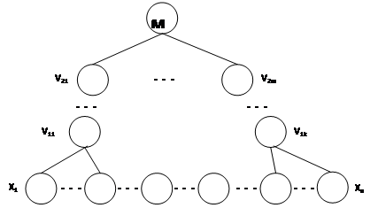 Представленный на рисунке 1.23 граф называют графом связей задачи. Данные о значениях показателей, характеризующих деятельность объекта (x1, …, xn), используются для расчета оценок первого уровня (v11, …, v1k). Полученные данные становятся первичными для задач следующего, более высокого уровня (v21, …, v2m). Пройдя через все уровни графа, выделенные в процессе декомпозиции, на заключительном этапе рассчитывается значение комплексной оценки (M) на основе значений вершин предшествующего уровня.