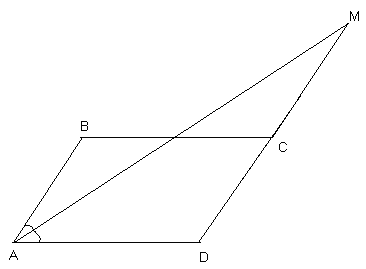 2. На рисунке ABCD — параллелограмм, AD=2AB, AM — биссектриса угла BAD. Докажите, что часть отрезка AM, лежащая во внутренней области параллелограмма ABCD, равна части, лежащей во внешней области.